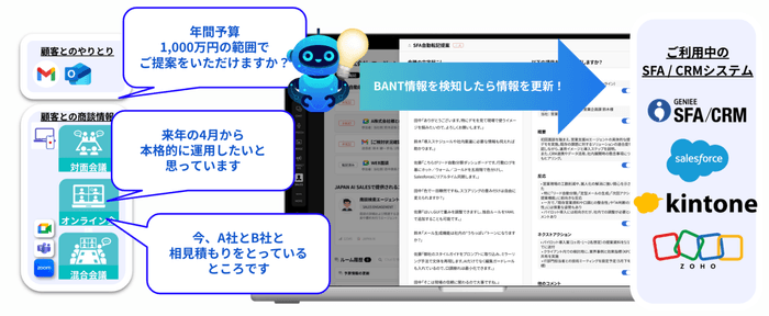 JAPAN AI SALESは、営業現場における日々の活動記録を自動的に顧客管理システムへ入力する営業部門向けのAIエージェントです。商談やメールのやり取りを分析し、必要な情報を適切な形式でGENIEE SFA/CRMやSalesforceなどの顧客管理システムに反映します。