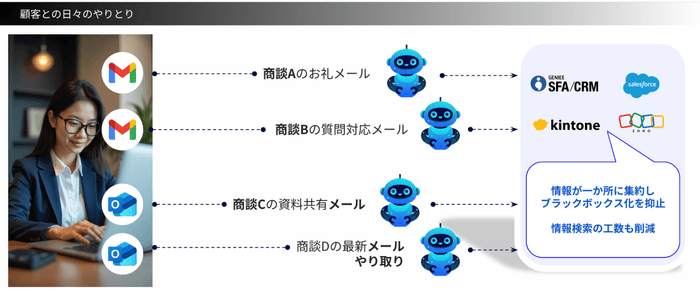 営業部門における日々の活動記録をAIが自動的に顧客管理システムへ入力するAIエージェントです。商談やメールのやり取りをAIが分析し、必要な情報を適切な形式で顧客管理システムに反映します。