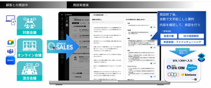 株式会社ジーニー(本社:東京都新宿区、代表取締役社長:工藤 智昭、以下ジーニー)のグループ会社である、AIを活用したプロダクト開発・販売を行うJAPAN AI株式会社(本社:東京都新宿区、代表取締役社長:工藤 智昭、以下JAPAN AI)は、顧客管理システムと連携し、AIエージェントが営業活動の記録作業を自動化する、営業部門向け新サービス「JAPAN AI SALES」の提供を開始したことをお知らせします。