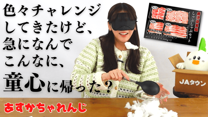 今回の配信はMCの貴島明日香さんが様々な企画に挑戦する「あすかチャレンジ」です。今回は目隠しした状態でおたまを使い、机の上のコットンをすくい上げて、制限時間内にボウルに移す「目隠しコットン」と、投げたティッシュに扇子で風を送り、一定時間空中に浮かす「扇子ティッシュ」に挑戦します。童心に帰ったかのようにゲームにチャレンジする、普段見られない貴島さんの姿をぜひお楽しみください。