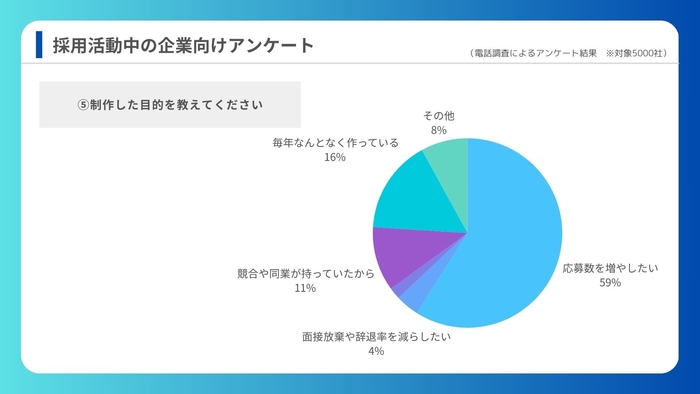 以上の調査結果から「売り手市場の採用活動では、ほとんどの企業が”採用に特化したサイト“を保有していること」「約5分の1の企業が、費用をかけて制作するのが当たり前の採用サイトを”一切費用をかけず“自社内で制作していること」また、「約3分の1の企業が採用サイトに期待する役割や目的も曖昧で、活用できていないこと」がわかりました。