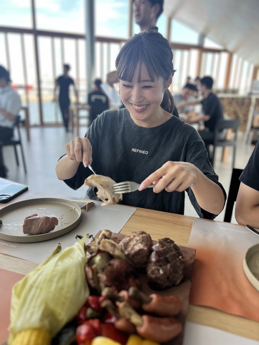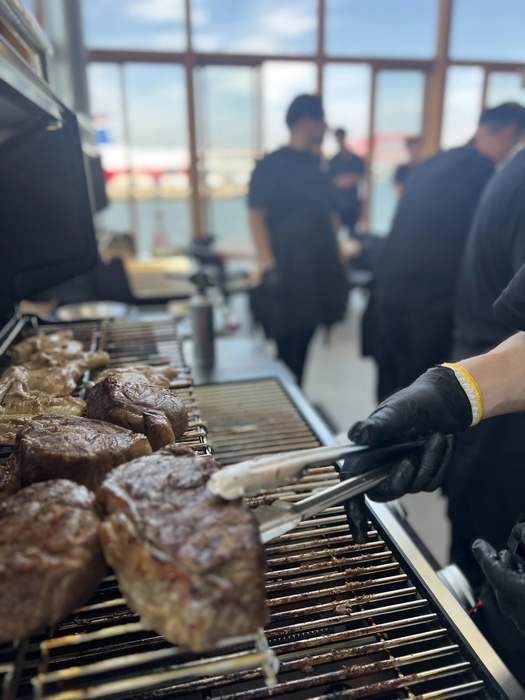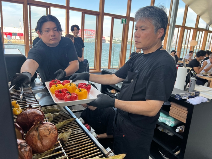 店舗スタッフは調理やオペレーションの確認を行い、来場者は大きなBBQグリルで焼き上げられる海鮮や野菜、三田ポークの塊肉をスマートフォンで熱心に撮影するなど、和やかな雰囲気の中で料理を味わいました。