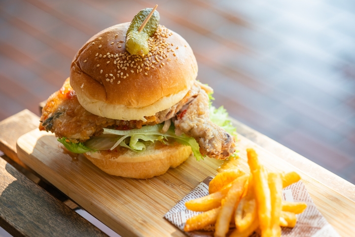 骨付きチキンレッグを丸ごと挟んだバーガーや揚げたてポテト、芝生や夕暮れの港をイメージしたモクテルなどのテイクアウトもご用意。