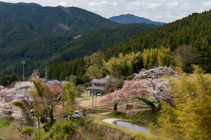 撮影地:三重県津市美杉町三多気「三多気みたけ)の桜」と呼ばれる約1.5kmの桜並木は、国の名勝に指定され、さくら名所百選にも選ばれています。桜のシーズンには、古桜の並木道が続く景色や、桜が棚田に映りこむ光景を見るため、多くの花見客が訪れます。