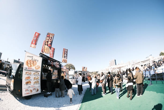 たこやき、やきそば、うどん、クレープ、クラムチャウダーなど、さまざまなキッチンカーや屋台を用意。お食事を希望される際はこちらをご利用ください。