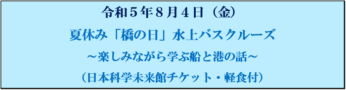 東京水辺ラインでは、水上バスによる周遊と様々な企画を組み合わせたイベント便を運航しています。この度、令和5年8月に開催するイベントが決まりましたのでお知らせいたします。