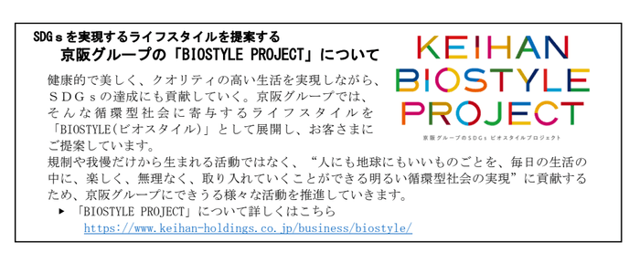 なお、この取り組みは、京阪グループが推進する、“SDGsを実現するライフスタイル”を企画・提案する「 BIOSTYLE PROJECT 」の一環として実施します。