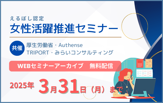 みらいコンサルティンググループ(本社:東京都中央区、代表:久保 光雄 岡田 烈司)は、2025年2月27日におこなったセミナー『えるぼし認定 女性活躍推進セミナー』をWEBにて2025年3月31日まで動画配信します。