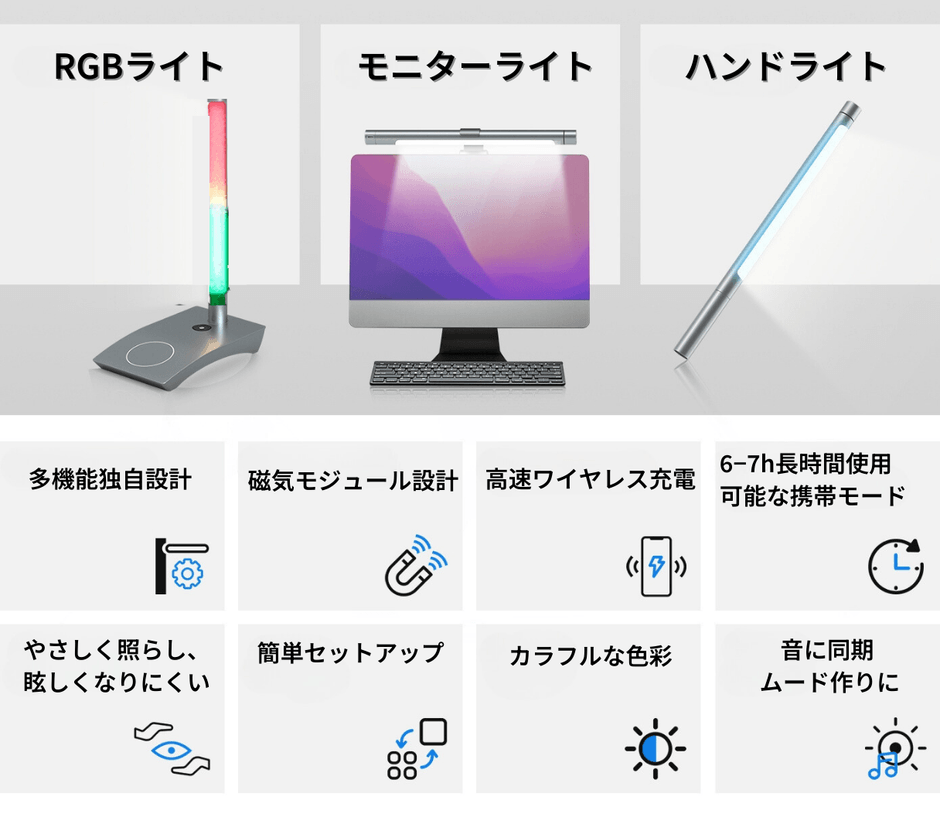 目に優しく明るい「BORING LAMP」は、デスクライトやモニターライトだけでなく、間接照明やハンドライトとしても活用できます。今までのデスクライトの常識を覆す4in1の多機能ライトが登場!