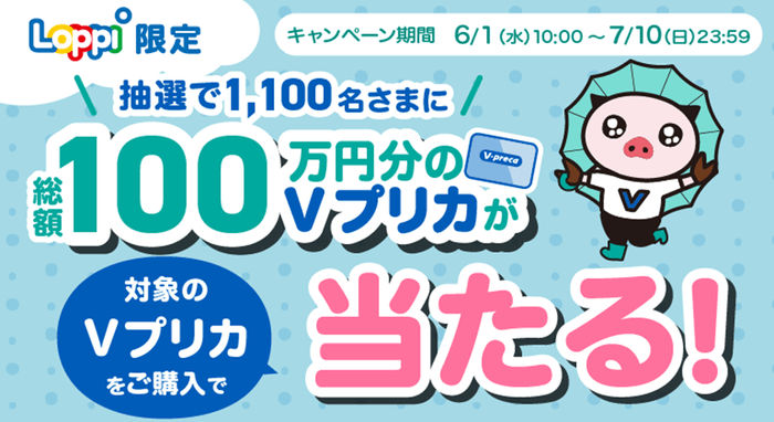 ローソンやミニストップなどに設置されているLoppiで対象のVプリカを購入すると、抽選で1,100名さまに総額100万円分のVプリカが当たる!