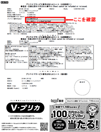 Vプリカ購入後、レジで受け取るプリペイドサービスお知らせシートに「当たり発行コード」の記載があれば当たりです。