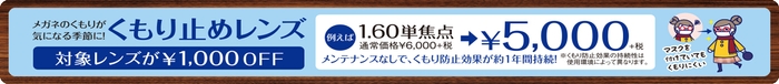 くもり止め機能付き対象レンズが1,000円OFF!マスクの装用や寒暖差でメガネのくもりが気になるこの季節、くもり止めレンズで快適な毎日を!