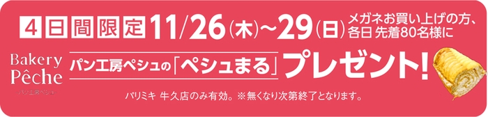 オープン記念としまして、メガネをお買い上げの方 各日先着80名様に、地元で愛されているパン工房ペシュの「ペシュまる」をプレゼントいたします!