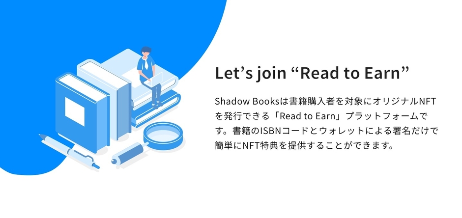 Shadow Booksは、書籍購入者を対象にオリジナルNFTを発行できる「Read to Earn」プラットフォームです。書籍のISBNコードとウォレットによる署名だけで簡単にNFT特典を提供することができます。