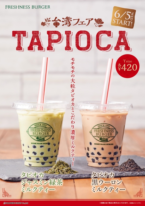 フレッシュネスバーガーでは大流行中の「タピオカドリンク」を気軽にお楽しみいただけるように“台湾フェア”と題して、食事と相性の良い甘さ控えめな大人の『タピオカ ジャスミン緑茶ミルクティー』、『タピオカ 黒ウーロンミルクティー』と『トンポーローバーガー』をご用意いたしました。