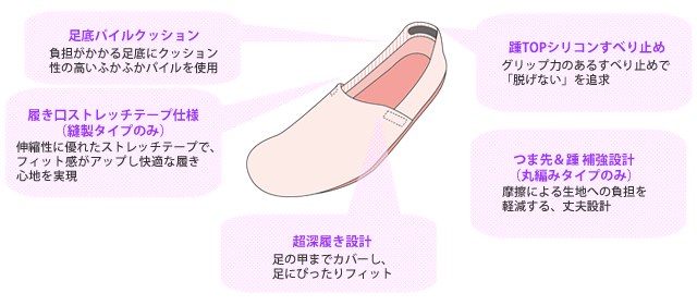 本商品は、足底部分に従来比約2倍のボリュームパイル生地を使用し、快適な履き心地を実現。足底は綿混素材で汗を吸うので長時間の着用も安心です。また靴の中でのズレを軽減するため、超深履き設計を採用し足にぴったりフィットします。縫製タイプと丸編みタイプの2種類のタイプを展開。