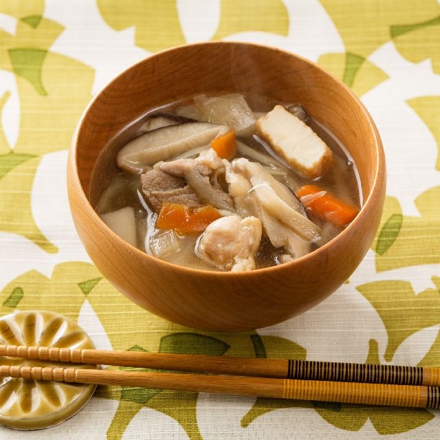 鶏肉、ごぼう、人参、蒟蒻、大根、椎茸の具材を京風の出汁で炊き込んだけんちん汁です。手作りで丁寧に仕上げた、お出汁たっぷりの出来栄えです。