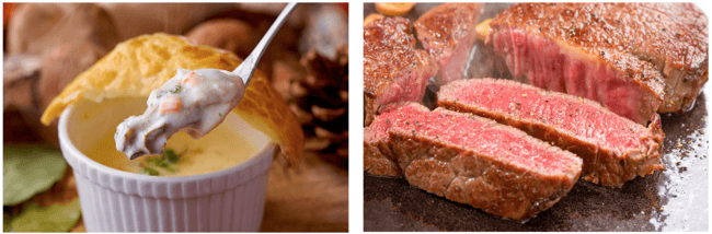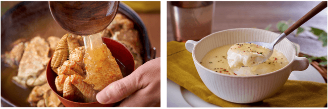 左:牡蠣入りのクラムチャウダーをパイ生地で覆った「牡蠣のパイ包み焼き」。パイにスプーンを入れた時に立ち昇る湯気と燻製にした牡蠣のスモーキーな香りをお楽しみください。