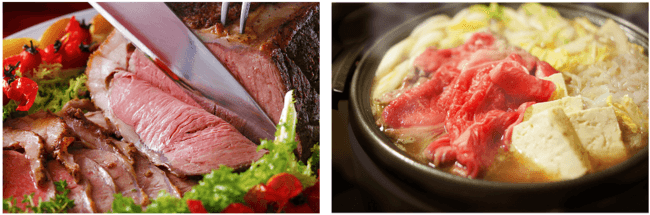 右:和のごちそうメニュー、すき焼きはテーブル上でお客様ご自身に炊き上げていただきます。甘辛い割下の染みた白菜や豆腐も牛肉に負けない美味しさです。