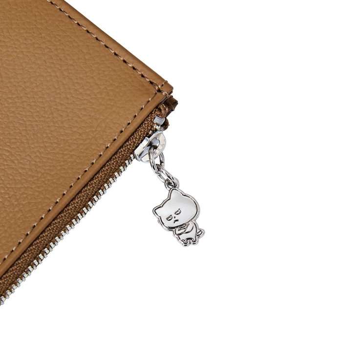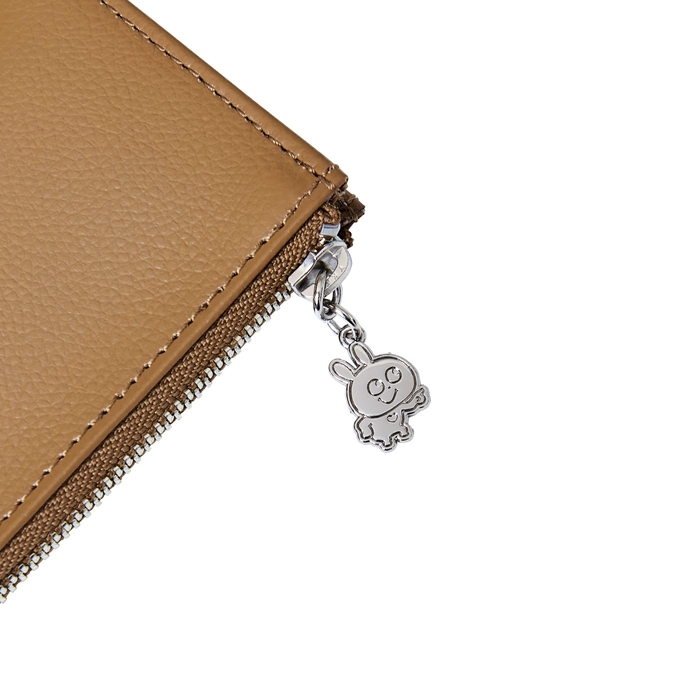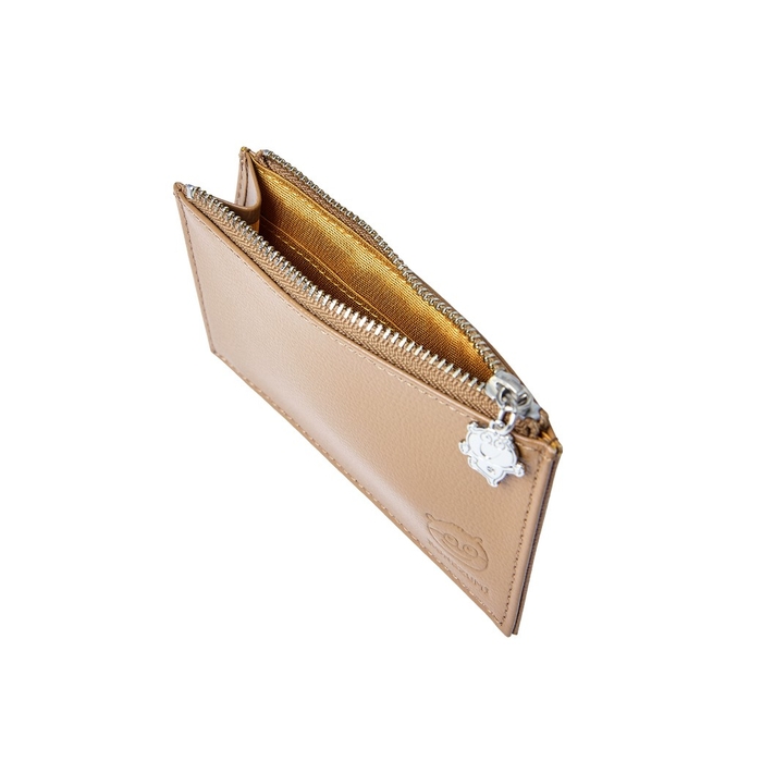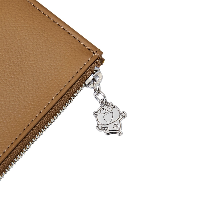 表面には、お顔を型押しで表現し、裏地にはキャラクターらしい色合いを配色しました。キャラクターモチーフのチャームが、ワンポイントのアクセントとして遊び心を添えています。