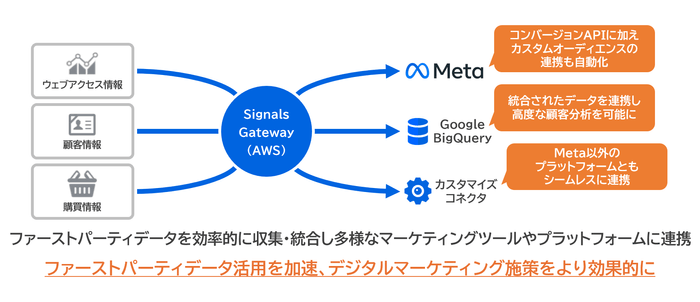 「Signals Gateway」は、Metaが提供するクラウドベースのソリューションです。企業のファーストパーティデータを効率的に収集・統合し、Meta広告をはじめ様々なマーケティングプラットフォームへ安全に連携します。これにより、企業はファーストパーティデータを有効に活用し、顧客理解を深め、マーケティング施策の精度を高めることができます。また、従来のオンラインデータの活用に加え、店舗データや顧客データベースなどのオフラインデータも活用可能となり、より包括的な顧客理解とデジタルマーケティングの高度化が実現します。
