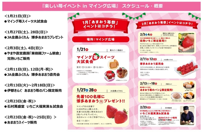 今年は博多あまおうにメインスポットをあて、苺を使用したスイーツを紹介しています。期間中JA全農ふくれんタイアップで博多あまおうの直売会や、苺スイーツ試食会を行う『楽しい苺イベント in マイング広場』も実施。