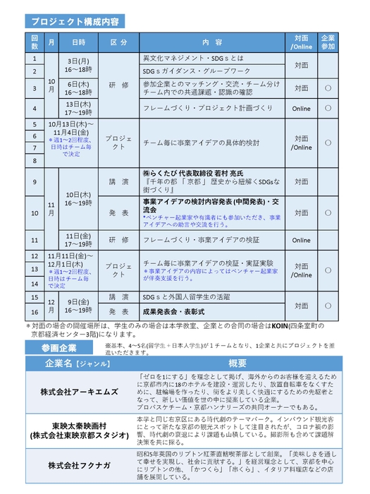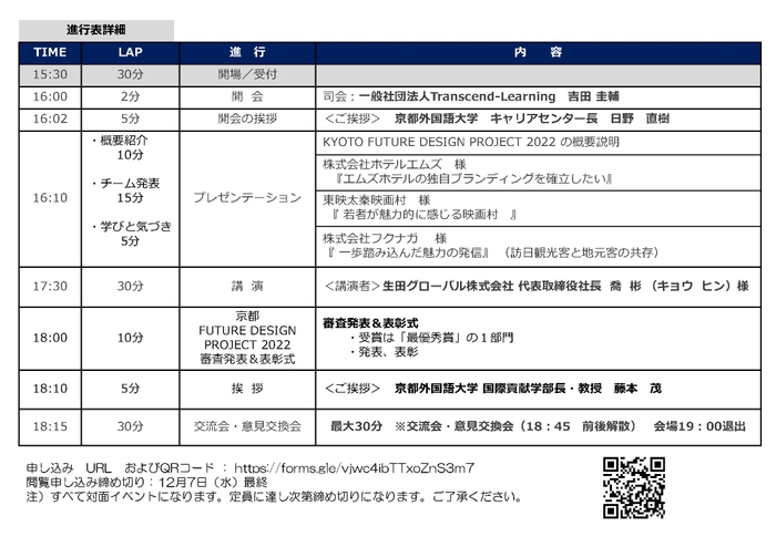 京都商工会議所と京都外国語大学では、京都企業におけるSDGs・多様性の視点からみた社会課題・地域課題の解決に向けて、留学生と日本人学生が京都企業の社員とチームを組み、新たな事業アイデアを創出する事業「KYOTO Future Design PROJECT」に取り組んできました。両者の産学連携事業としては初の試みとなります。概要につきましては添付資料①をご参照ください。