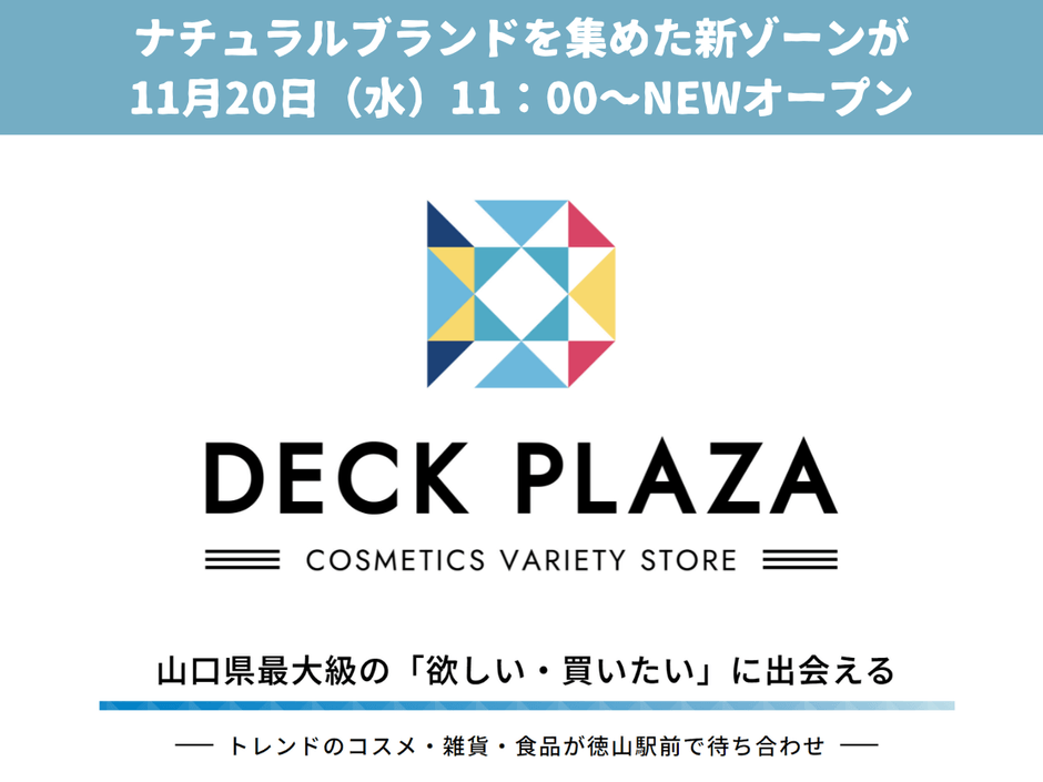 JR徳山駅前商業施設の徳山デッキ(TOKUYAMA DECK、所在地:山口県周南市)D2エリアの『DECK PLAZA(デッキプラザ)』内にナチュラルブランドゾーンが2024年11月20日(水)11:00~オープンいたします!
