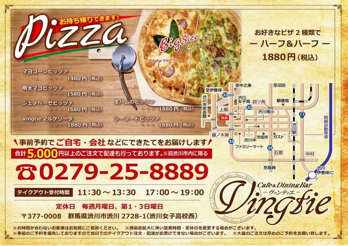 また合計5,000円以上のご注文で配達も行っている為、(旧渋川市内限定)自宅や会社でのパーティにもピッタリ!テイクアウトメニューは以下を要チェック!
