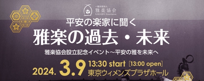 一般社団法人雅楽協会(代表理事:小野真龍)主催、「平安の楽家に聞く雅楽の過去・未来 雅楽協会設立記念イベント~平安の雅を未来へ」が2024年3月9日(土)に東京ウィメンズプラザ ホール(東京都渋谷区神宮前5-53-67)にて開催されます。