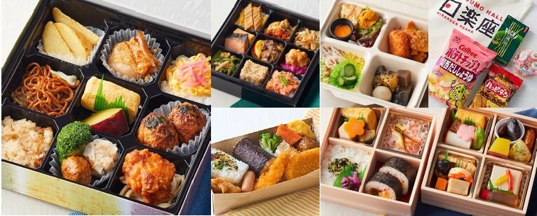 ポテトフライ、焼鳥、ちらし寿司、焼きそば、だし巻き卵・さつまいも蜜煮、たこ焼き、五目ご飯、焼売・肉団子・ブロッコリー、塩こしょうスパゲティ・鶏唐揚げ