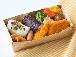 Vegetable Furikake Onigiri, Roasted Seaweed Onigiri, Fried chicken, Minced meat cutlet, Fried shrimp, Shumai, Omelet, Broccoli, Meatballs, Boiled carrots, Wiener