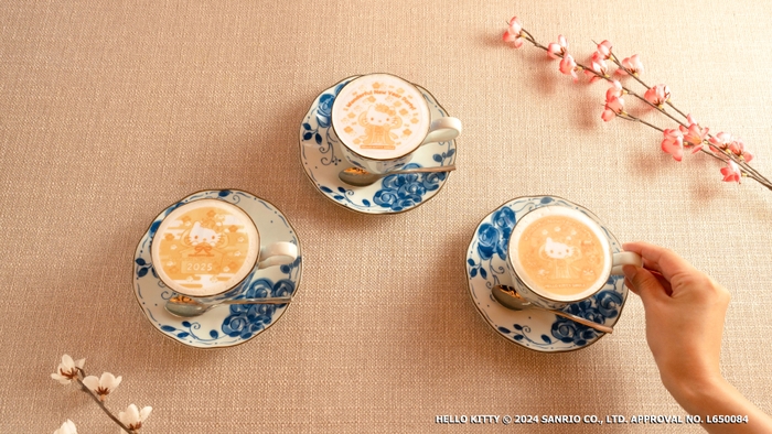 今回は、ハローキティが大好きなアップルパイの風味を味わうことができる“アップルパイティーラテ”や、濃厚なチョコレートが口いっぱいに広がり、贅沢な味わいをお楽しみいただける“チョコレートミルク”が登場。寒い冬にほっと一息つける、甘くとろけるドリンクです。また、本ドリンクの提供に伴い、冬季限定デザインのラテアートが登場。乙姫の衣装を着たハローキティが2025年の文字と一緒に新年をお祝いするこの時期だけの限定デザインとなっております。
