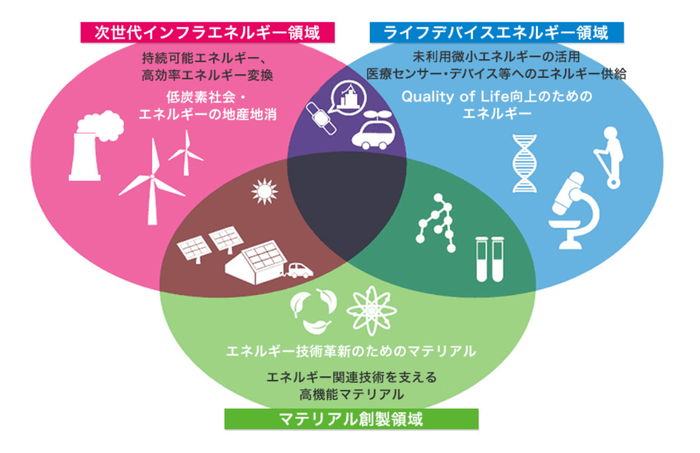 「次世代インフラエネルギー領域」では、持続可能エネルギーとしての太陽由来エネルギー(核融合、太陽光、熱)や地球由来エネルギー(風力、地熱、核分裂など)、高効率エネルギー変換・貯蔵技術について学びます。「ライフデバイスエネルギー領域」では、生体におけるエネルギー変換・利用や、医療センサ・デバイス等へのエネルギー供給のための微小エネルギーの活用について学びます。「マテリアル創製領域」では、上記2つの領域を支える高機能マテリアルについて学びます。
