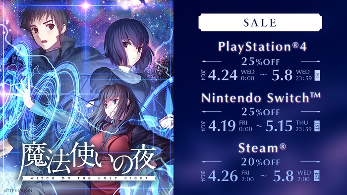 株式会社アニプレックス(本社:東京都千代田区 代表取締役 岩上敦宏 以下アニプレックス)は、PlayStation®4・Nintendo Switch™向け『魔法使いの夜』が、本日4月26日(金)までに全世界累計出荷本数(※1)が20万本を突破したことをお知らせいたします。 また、各プラットフォームにてセールを実施しております。「Steam🄬」は5/8(水)2:00まで、「PlayStation® 4」 は5/8(水) 23:59まで。「Nintendo Switch™ 」は5/15(水) 23:59まで実施いたします。