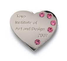 ピンズファクトリーが2001年から製作させていただいている「卒業記念ピンズ」は、毎年デザインのモチーフが違うものに変わりますが、迎えて7回目となる2007年の作品はハート型のベースにラインストーンがあしらわれ、ニッケルメッキの光沢仕上げから放たれる輝きが、アクセサリーのような雰囲気を演出しています。