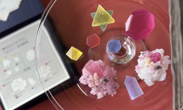 ルビーの赤い表現を引き立てるべく、青や赤などの色を使った鉱物も一緒に構成しました。見た目の美しさだけでなく、色ごとに味が違うのも特徴。味も裏切らないを目指した、ハラペコラボの琥珀糖こうぶつヲカシ。青はミント、水色はサイダー、黄色はレモン、緑はラ・フランス、濃い赤はカシス、紫はブルーベリー、黒は黒ゴマとメインのルビーに使われているラズベリーの他にも食べ応えのある構成になっている。