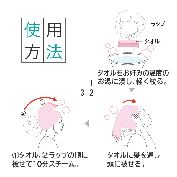 使用方法は①タオルをお好みの温度のお湯に浸し軽く絞る。②タオルを頭にかぶります③さらに上からラップを着せて10分間スチームで完了。