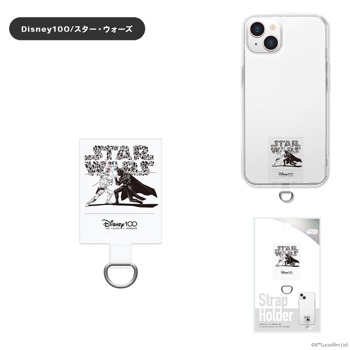 ディズニー100にインスパイアされたデザインのストラップホールのないケースに挟むだけでストラップが付けられるダイカット ストラップホルダーです。端末とケースの間にストラップホルダーを挟み込むだけで、ストラップホールを付加します。(※お手持ちのケースや充電口の形状によってはホルダーが収まらない場合があります。)端末やケースに貼り付けしないので、汚れずいつでも付け外しが可能です。