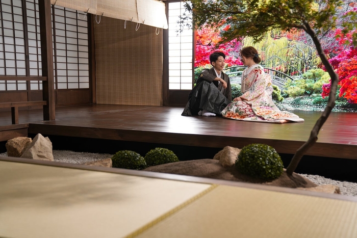 モニターに映し出されるのは、四季折々の風景や和を感じる絵画など。本物の和庭園のような奥行きや、桜や紅葉などお好みの季節の映像、レトロな壁紙風、スタジオの中だけでさまざまなバリエーションの撮影が叶います。