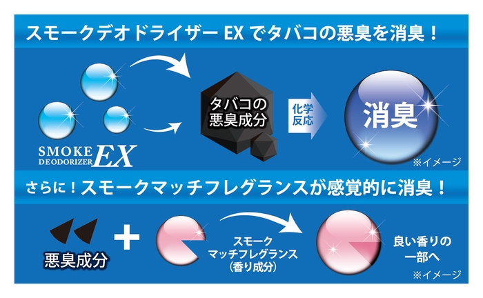 2019年に発売した本格処方タバコ消臭「スモークデオ」シリーズ。タバコのニオイに特化した中和型消臭成分「スモークデオドライザーEX」を配合し、化学反応でタバコのニオイを消臭する消臭芳香剤です。今回はそのスモークデオシリーズの消臭成分が従来品から1.5倍に増量されたストロングタイプの登場です。