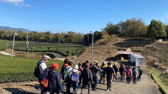 実際にウォーキングコースを歩いて頂き、その後は食文化体験として、特産物である茶葉やしいたけを用いた軽食を提供し、五感で南山城村を体験して頂きました。その後、地域愛着度や食文化などに関するアンケートを実施しました。この結果をもとに、問題解決に向け研究を行っています。この結果や活動内容を、プロジェクトの成果として京都府や南山城村村長様へご報告しました。