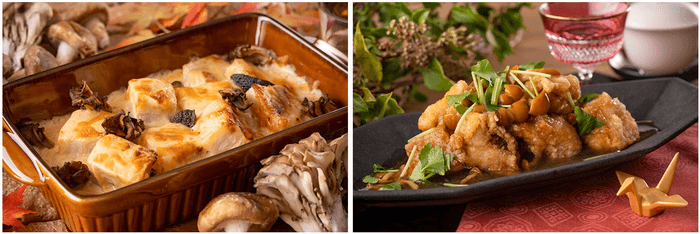 右:「鶏肉の美味だしなめこ餡かけ」。からりと揚げた鶏肉に、なめこを使った和風餡をかけた一品。ワインはもちろん、ご飯も進む美味しさです。