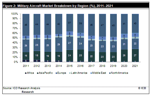 軍用機の最大市場である米国、欧州の同盟国、そしてアジア太平洋、ラテンアメリカ、中東の諸国は、この10年間アフガニスタンやイラクでの戦争で軍用機を継続利用しており、経年劣化した軍用機の置き換え需要が発生しています。