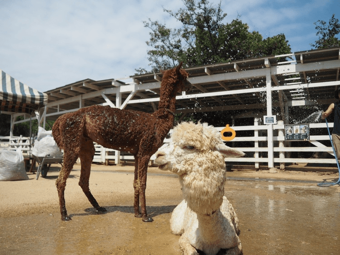 また、アルパカの水浴びイベントも開催。夏の期間はふわふわの毛をカットし、スタイリッシュな姿になっているアルパカたちに冷たいシャワーをかけてあげることができます。暑さに弱いアルパカたちに水浴びをさせてあげ、一緒に涼しさを感じてみてはいかがでしょうか。