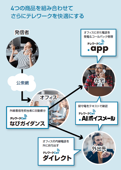ネクストジェンはこのようなテレワーク時の課題を解決するため、それぞれ特長の異なるグループ各社の電話ソリューションを『テレワークcall』として集約いたしました。