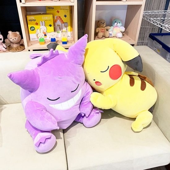 すやすや超・特・大♡つられて寝ちゃいそうなすやすや眠るピカチュウとゲンガー。もちもちだし、ポケモンぬいぐるみ、すごいぞ!