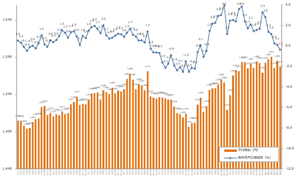6月度の三大都市圏平均時給は、1,577円。