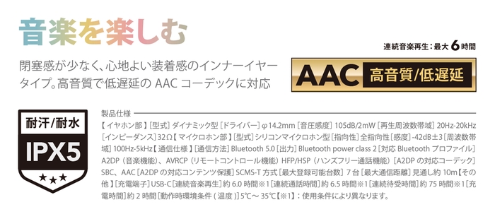 耳に負担の少ないインナーイヤー型ワイヤレスステレオイヤホンです。省電力、高速通信のBluetooth® 5.0搭載で高音質・低遅延の「AAC」にも対応し快適な音質を楽しめます。イヤホン部は心地のよい装着感のインナーイヤー型を採用し、長時間の使用にも最適なデザインとなっています。ケーブル部に音楽再生/停止、着信応答/終話が快適にできるマイク付きリモコンを搭載。また、IPX5防水相当の防滴対応なのでランニングやスポーツ時の汗など日常生活の中での防水・防汗設計を備えています。