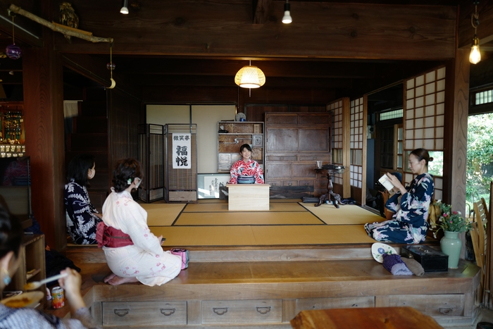 季節を感じる着物を纏い、お庭の紅葉を眺めながらお点前を楽しむ。心地よい秋の風を感じながら、三味線の音色に耳を傾け、生け花を眺める。お腹がすいてきたら、筑波山名物のみよこの七味をかけた豚汁と炊きたての栗ご飯で舌鼓。張りのある声で語られる講談を聞きながら、日本の伝統芸能に親しむ。